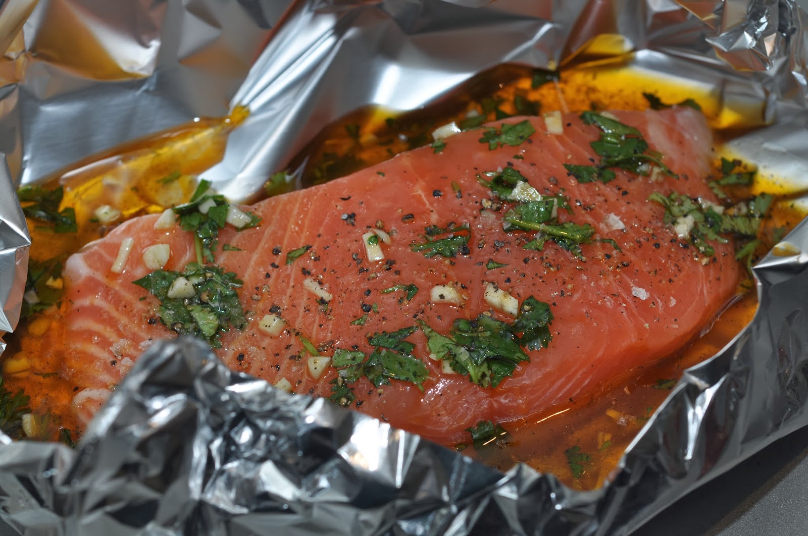 Lay out a piece of aluminum larger than your piece of fish and create somewhat of a boat shape placing it on a cookie sheet.